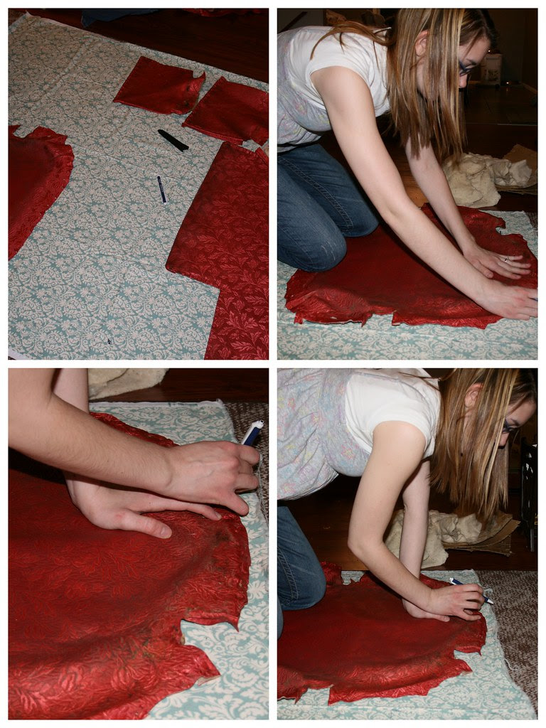 Next, I didn't take pictures of this part (should have!), but we unpicked the piece where your back rests, so that we could get a real dimension of what those pieces are before the piping is sewn in. Then we laid out all the pieces we carefully took off, onto my beautiful fabric.